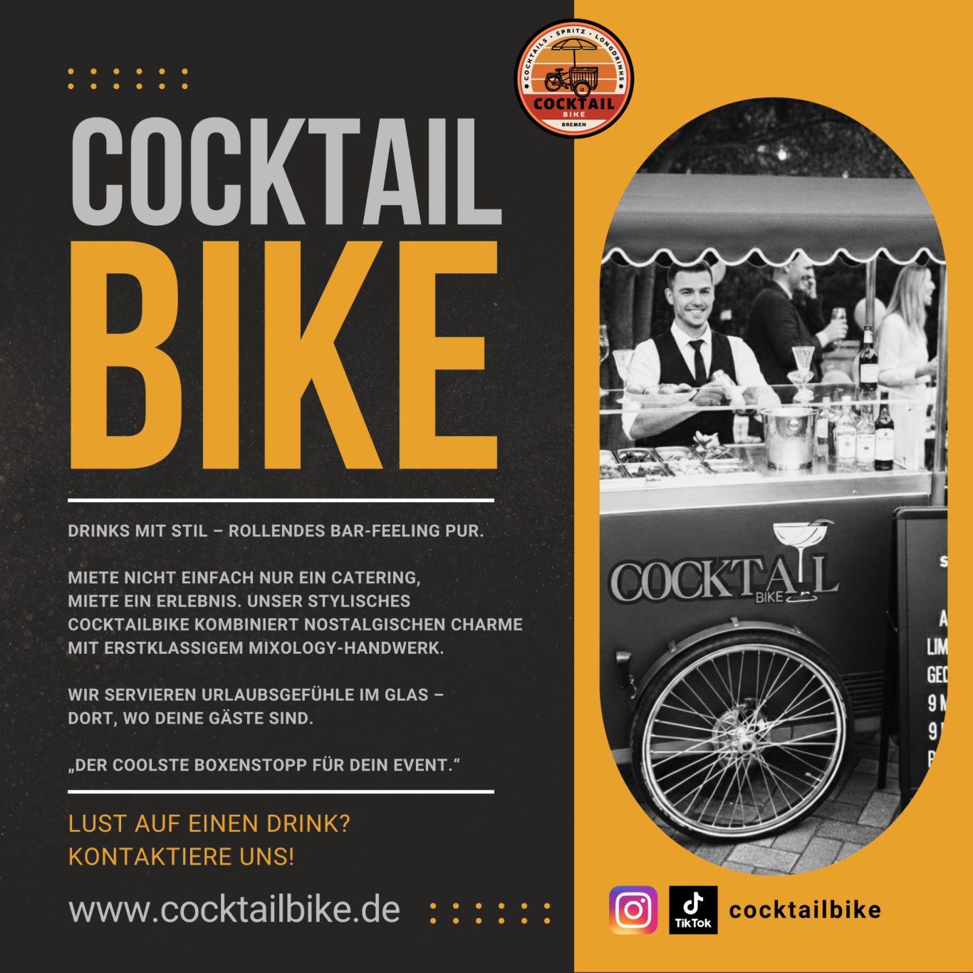 Egal ob Hochzeit, Geburtstag oder Firmen-Sause: Unser Cocktail Bike kombiniert nostalgischen Charme mit erstklassigem Mixology-Handwerk. Handwerklich perfekt, unverschämt lecker und „der coolste Boxenstopp für dein Event“.